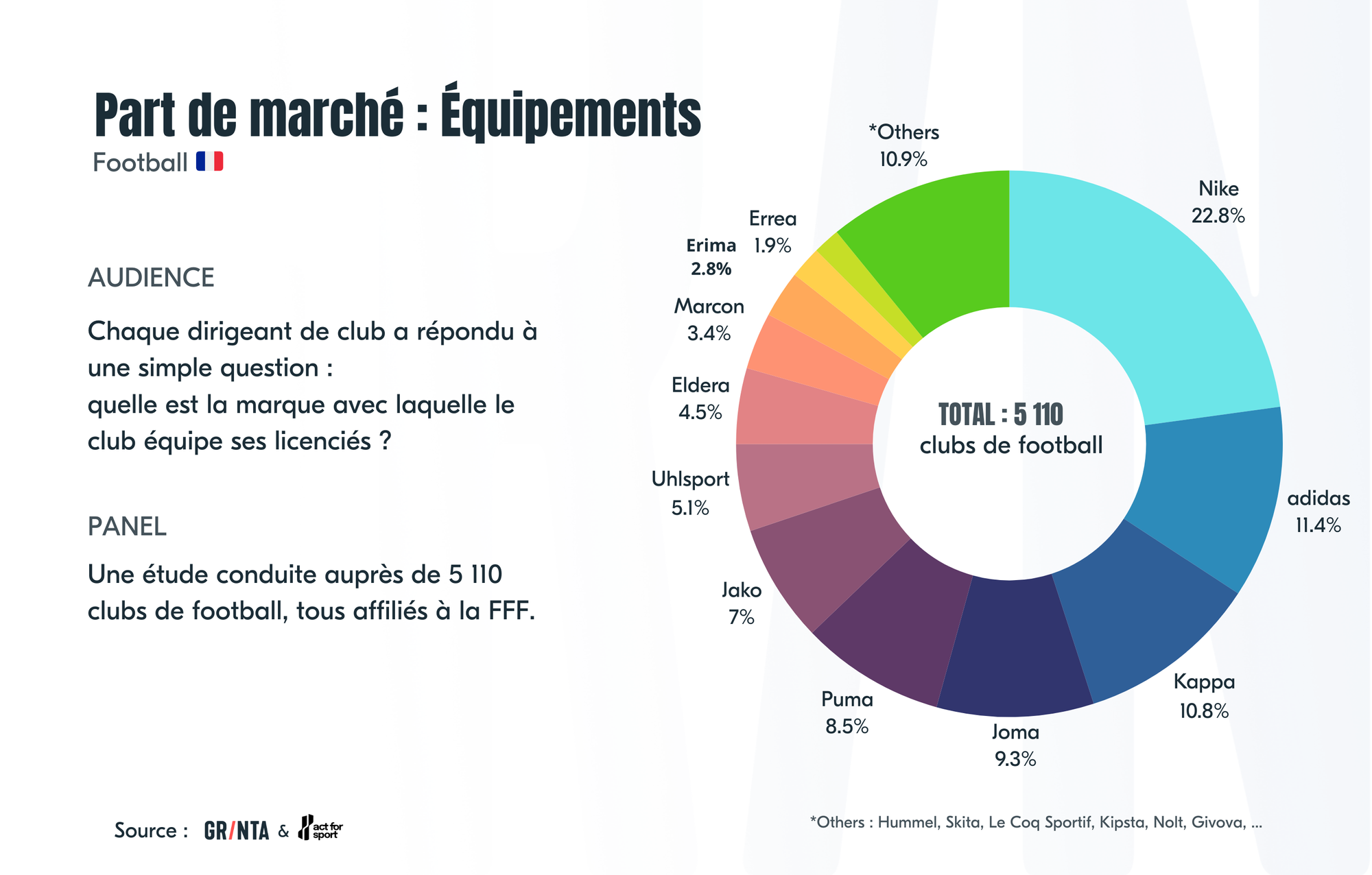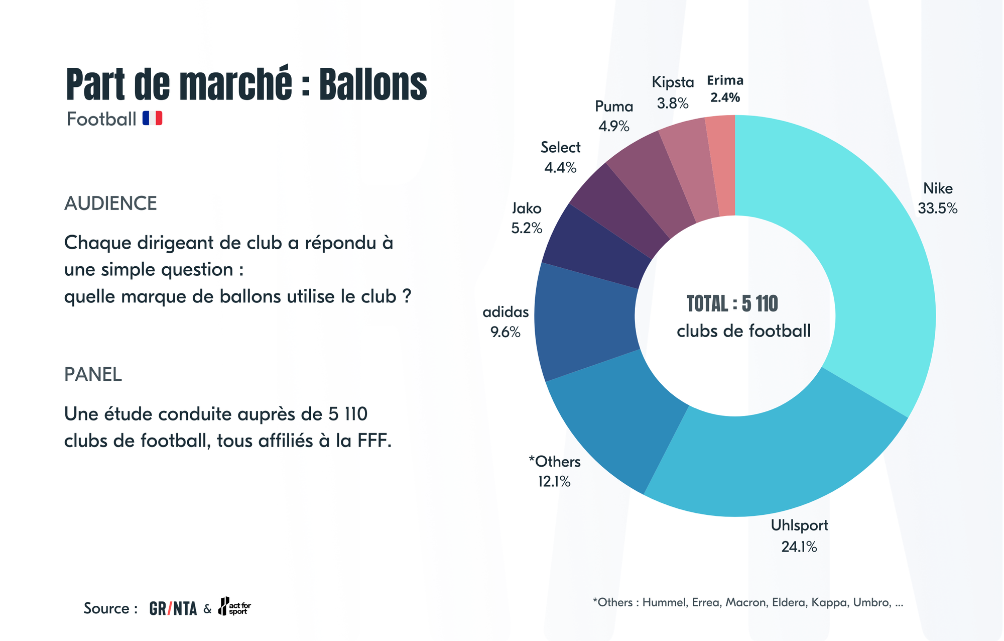 Grinta et act for sport partagent depuis quelques saisons un système de données, alimenté par les clubs eux-mêmes. D'une part, parce que nous sommes tous deux des Sporting Goods Lovers, mais aussi parce que ce système sert nos missions et enjeux respectifs. Cette infrastructure data collecte chaque saison des informations assez classiques type nombre de licenciés, nombre d'équipes féminines, etc ... mais aussi, plus pointues type club sous contrat, marque textile, marque de ballons, ainsi que le rôle au sein du club de chaque interlocuteur, permettant un qualification ultra-fine de l'audience assurant une crédibilité des informations partagées. Cette saison, 5 110 responsables de clubs, présidents ou membres du bureau, ont partagé des informations concernant notamment la marque des équipements et des ballons achetés par le club.