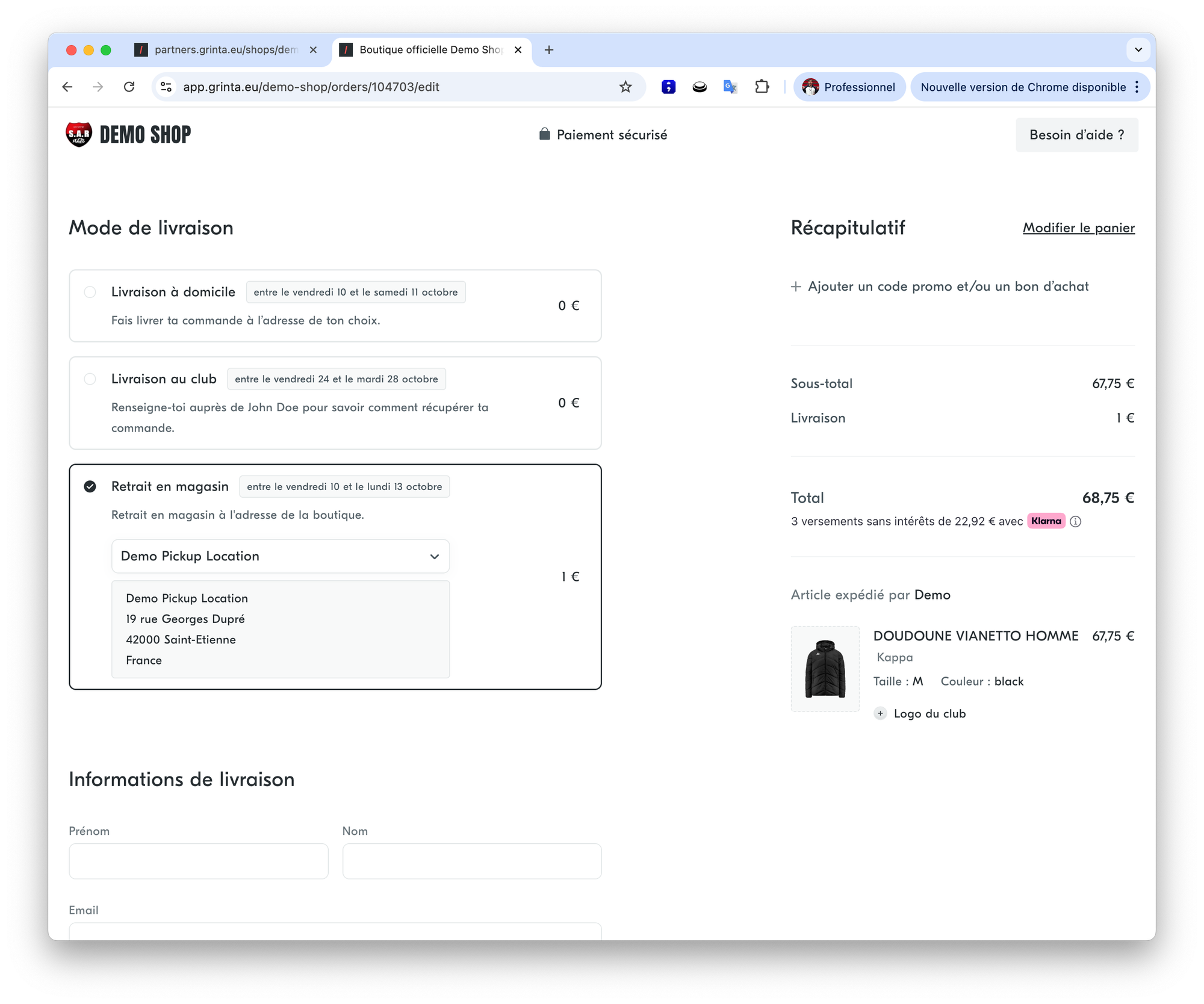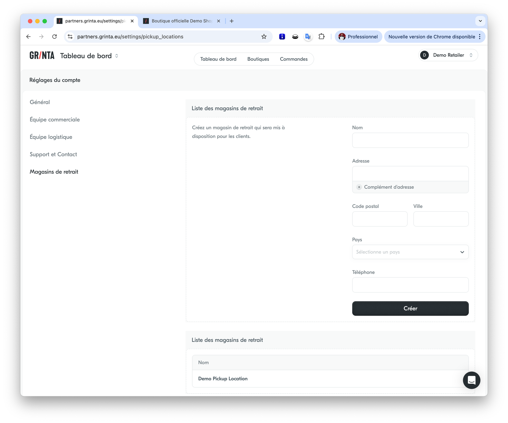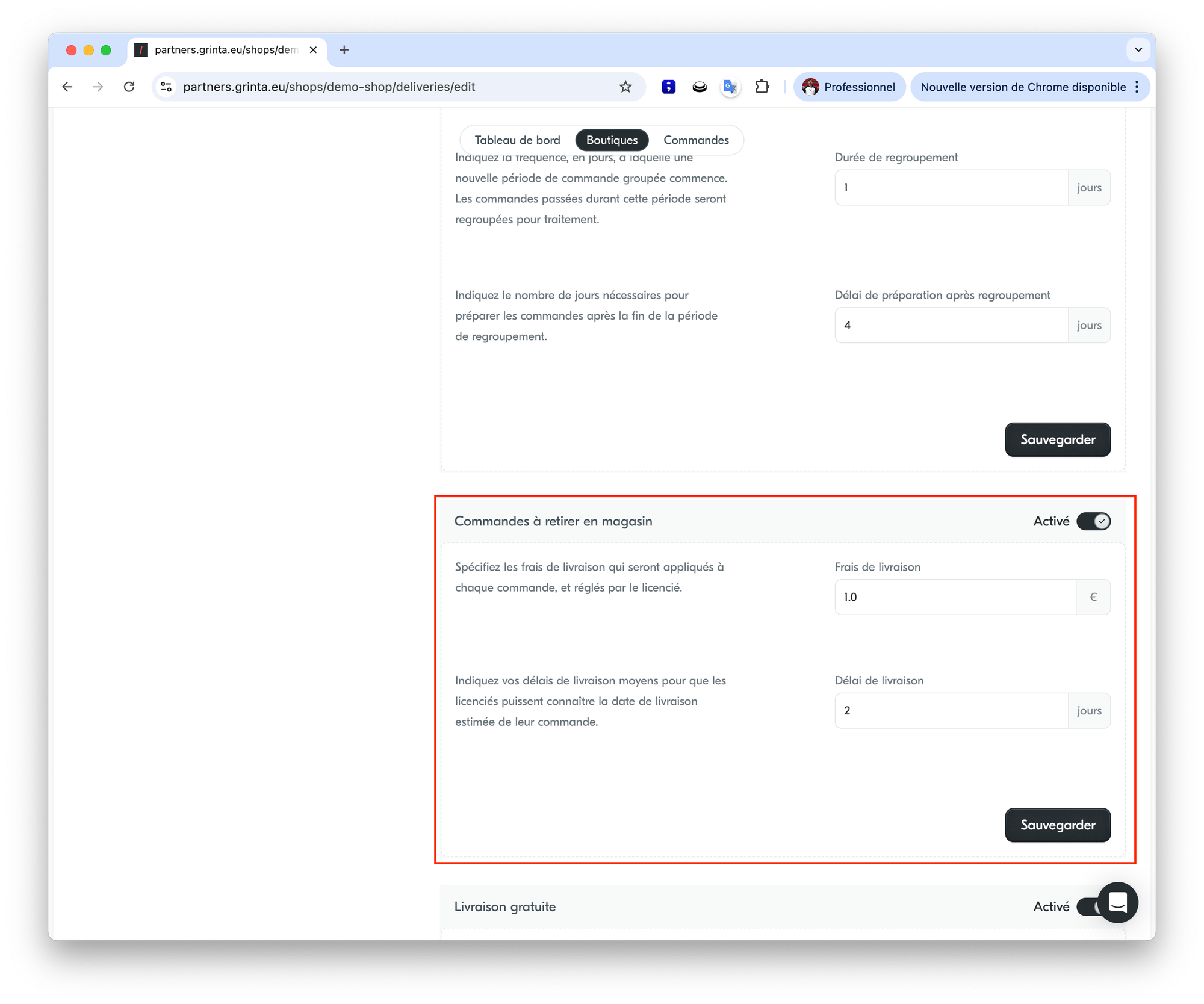 - Vos délais de livraison et les éventuels frais de préparation de commande que vous souhaitez prélever sur chaque retrait en magasin.