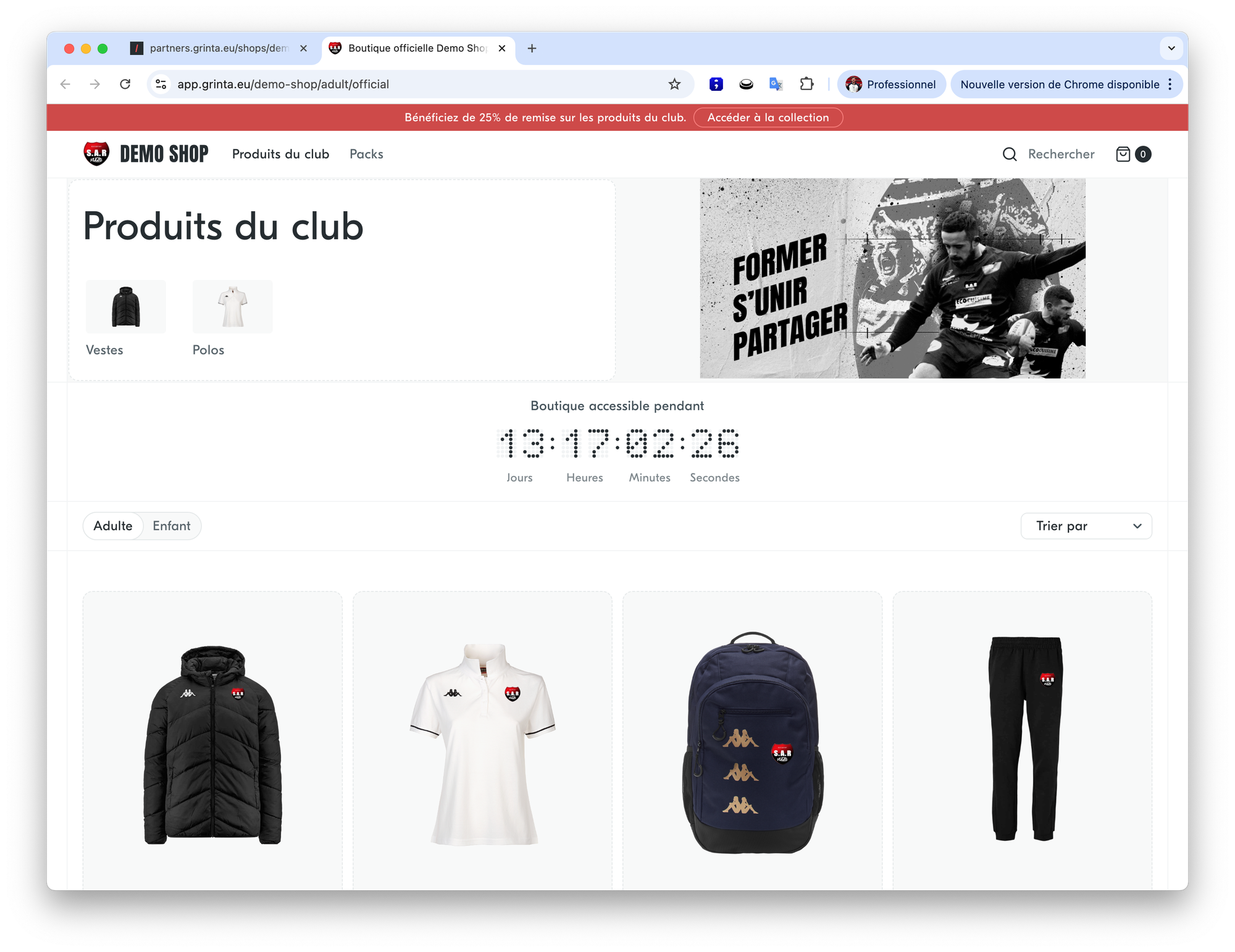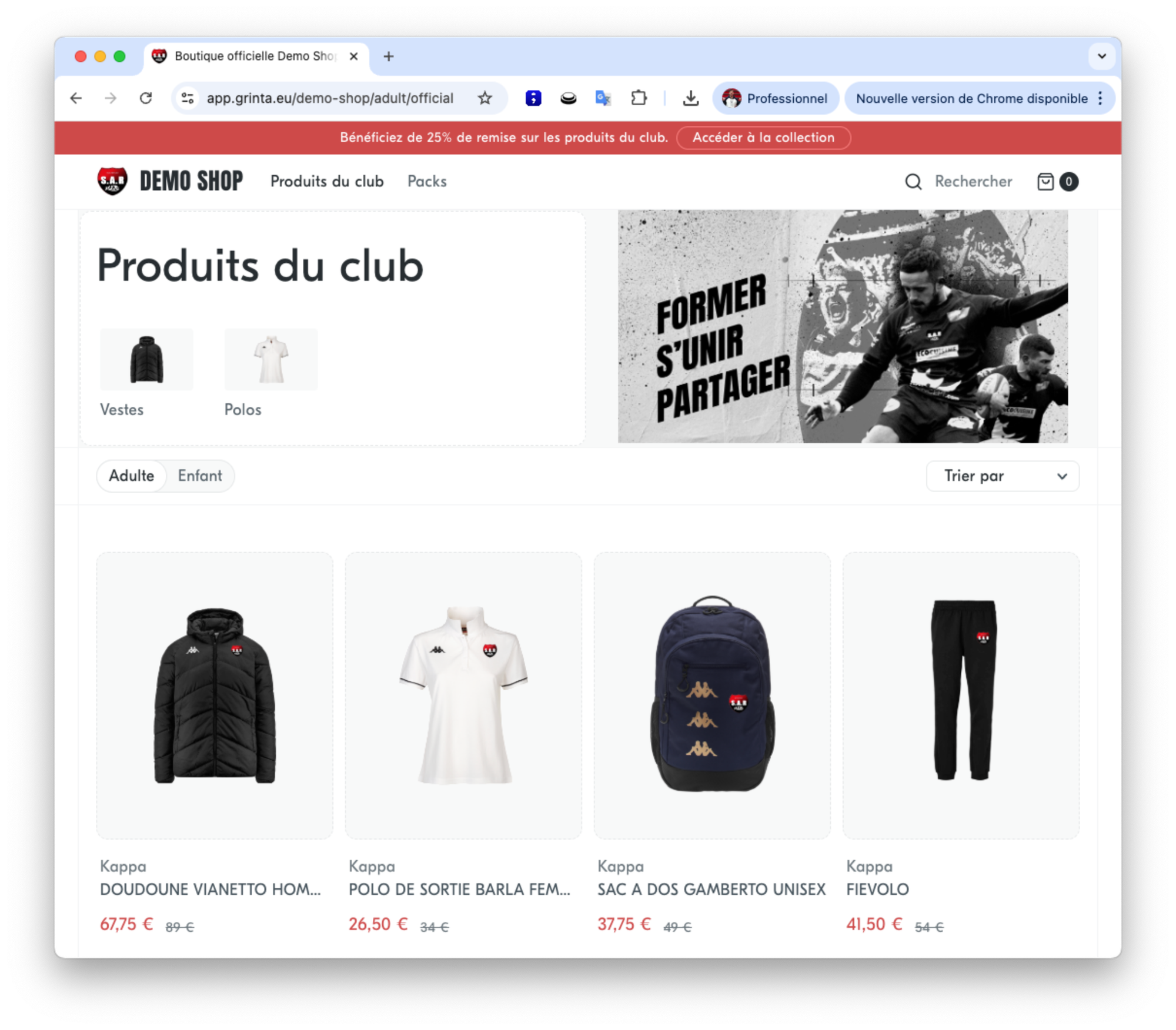 Les clubs peuvent maintenant ajouter une image de couverture sur la page d’accueil de leur boutique. Idéal pour les bénévoles qui souhaitent donner un supplément d’âme à leur site. L’ajout de l’image de couverture se fait depuis l’espace du club. Les images importées peuvent être remplacées ou supprimées à tout moment depuis ce même espace, ce qui rend les bénévoles parfaitement autonomes. À noter que le commercial a aussi accès à cette fonctionnalité.