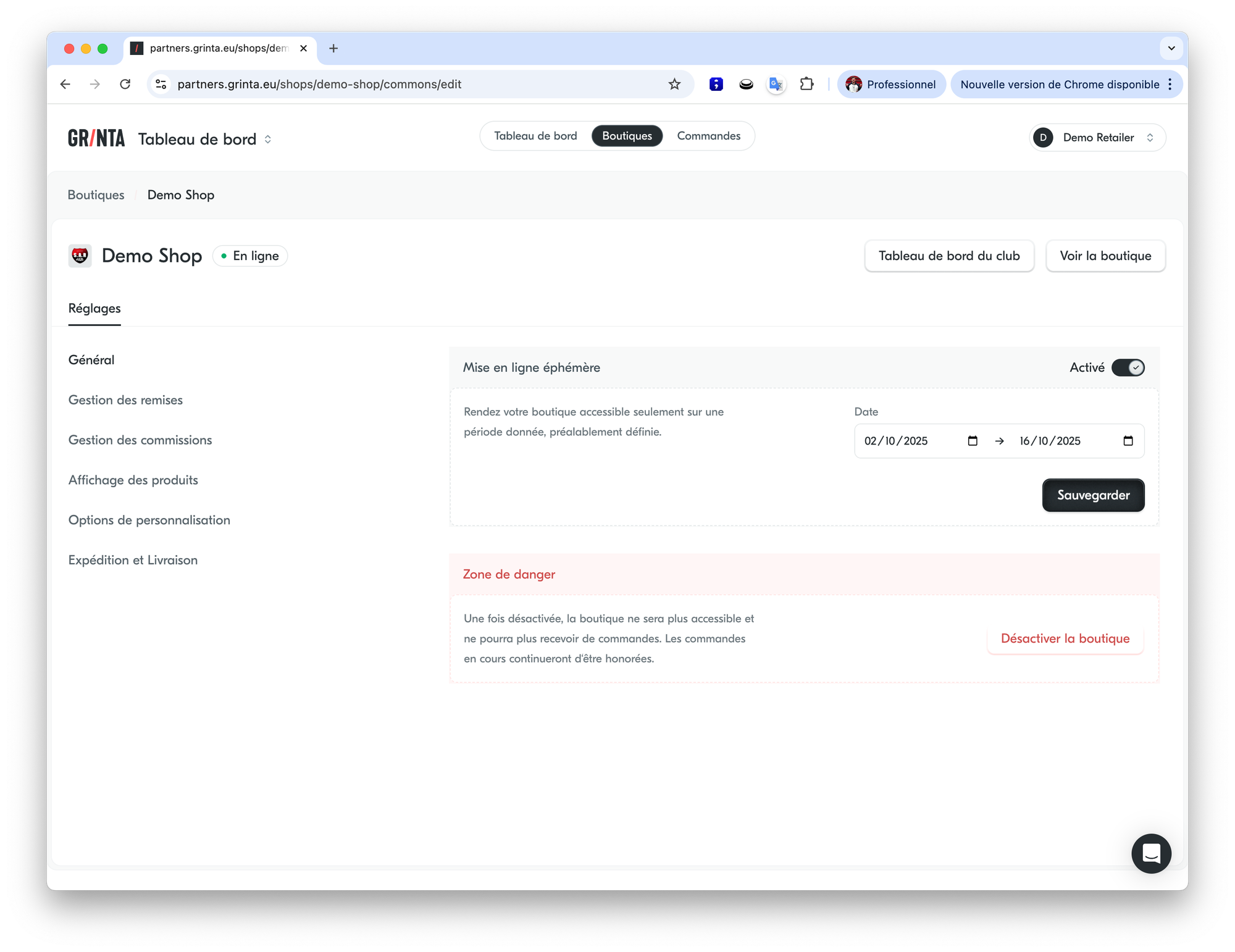Désormais, vous pouvez créer des boutiques éphémères. C’est-à-dire que il est possible de programmer une date d'ouverture et une date de fermeture pour chacune de vos boutique club — les deux dates étant requises. Quand la date de mise en ligne est atteinte, la boutique est publiée automatiquement. Et quand la date de fin est atteinte, la boutique passe hors ligne.