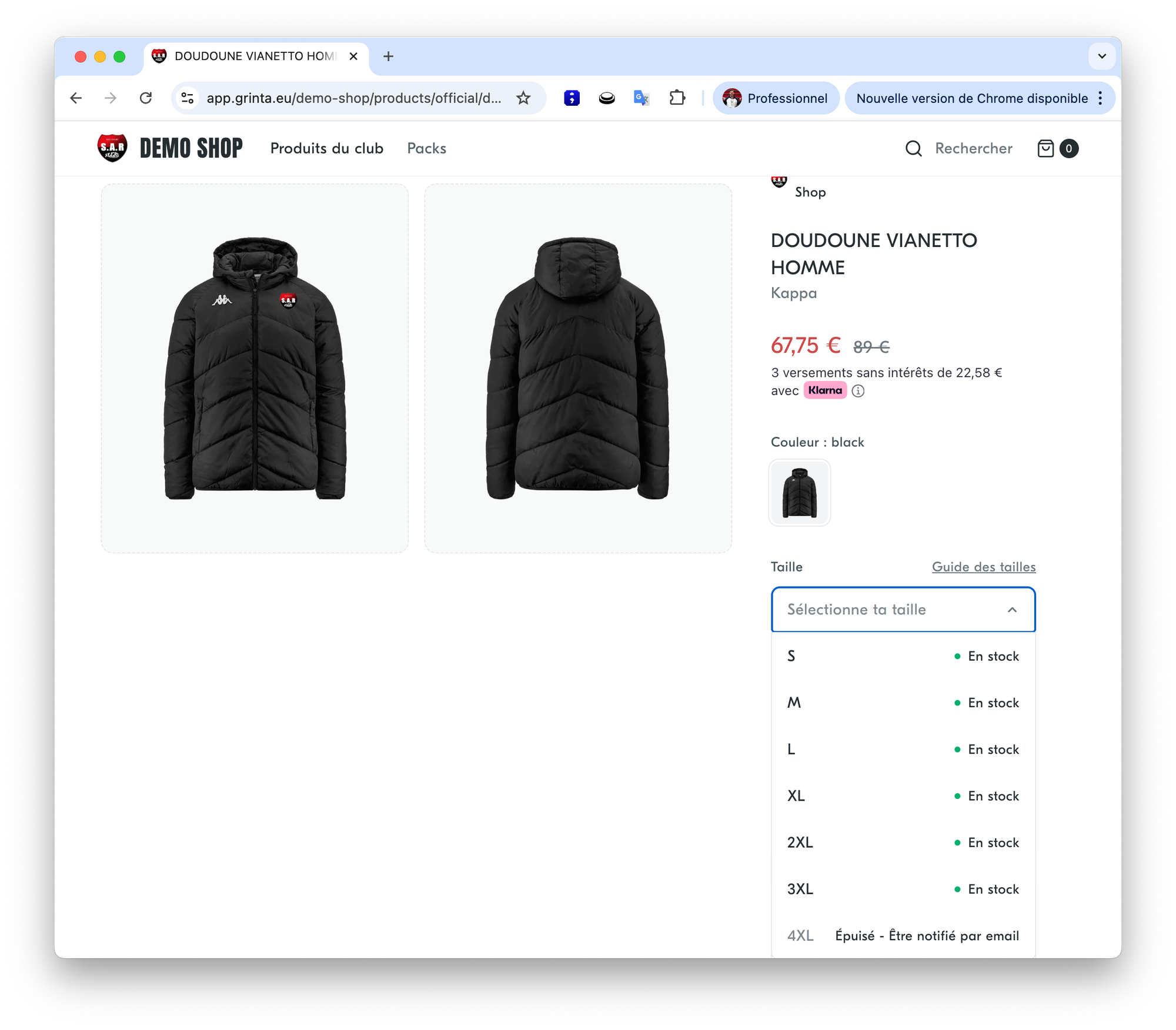 Qu’est-ce que ça change pour les licenciés ? Les licenciés de vos clubs sont sûrs de commander un article disponible. Concrètement, quand le licencié consulte la page d’un article Kappa sur la boutique de son club, une pastille lui indique si la taille est en stock. Et ce n’est pas tout. En cas de rupture, le licencié peut demander à recevoir un e-mail automatique au moment du réassort. Pas de relances à prévoir de votre côté. La boutique s’occupe de tout.